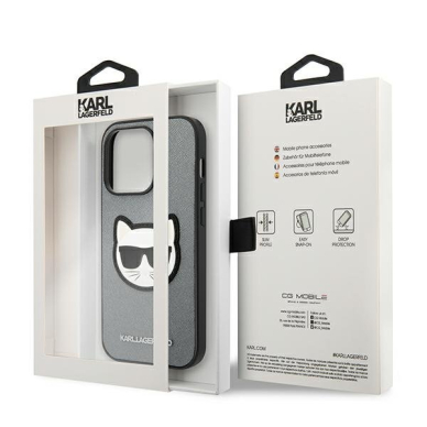 Dėklas Karl Lagerfeld Saffiano Choupette Head Patch KLHCP14XSAPCHG iPhone 14 Pro Max Sidabrinis